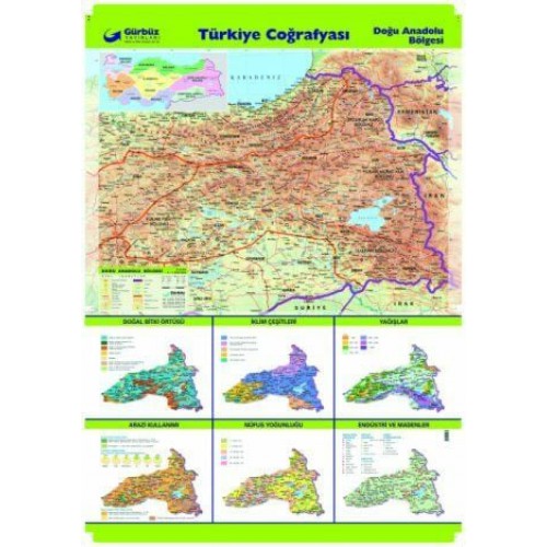 Doğu Anadolu bölgesi fiziki haritası, bu bölgenin arazi kullanımını, doğal bitki örtüsünü, endüstri ve madenlerini, iklim çeşitlerini, yağışlar ve nüfus yoğunluğunu gösteren altı çeşit tematik haritayı da içermektedir.